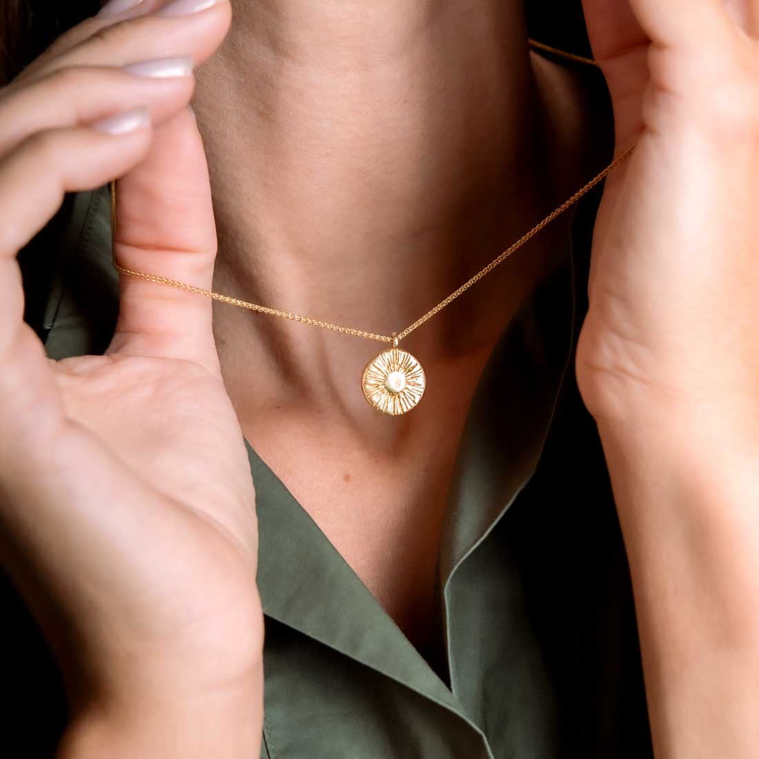 Der Aureon Anhänger aus 22K Gold ist ein kreisrunder Anhänger mit einer eingravierten Sonne. Sein Design verbindet Schlichtheit mit einem dezenten Detail, das an die Wärme und Strahlkraft des Sonnenlichts erinnert.